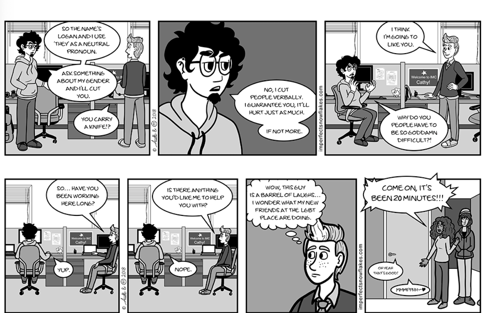 Ontto-Panula pondered that it can be hard to find a community as a young queer person, and drawing comics requires minimal resources—just a pen and paper. He mentions that one of the appealing aspects of comics is that you don't need to be a traditionally skilled artist. An unconventional or “ugly” drawing style can be just as compelling, as this aesthetic, and DIY spirit has a strong tradition in comics. Developing drawing skills can become a valuable social capital, allowing one to gain popularity and build networks by creating cute Pokémon illustrations or funny caricatures. Jesse Ghost added that for many young people who are uncertain about their future paths and education, comics can offer a relatively accessible and inviting approach. Annukka Leppänen exclaimed, “It’s just so cool,” emphasizing the unique ability of comics to combine writing and drawing. Comics serve as a perfect medium for self-expression and efforts to communicate with the world. For young queer people, this opportunity for self-expression may be hampered by various challenges they face. However, comics can offer a means to share their experiences and connect with others who may relate to their struggles.