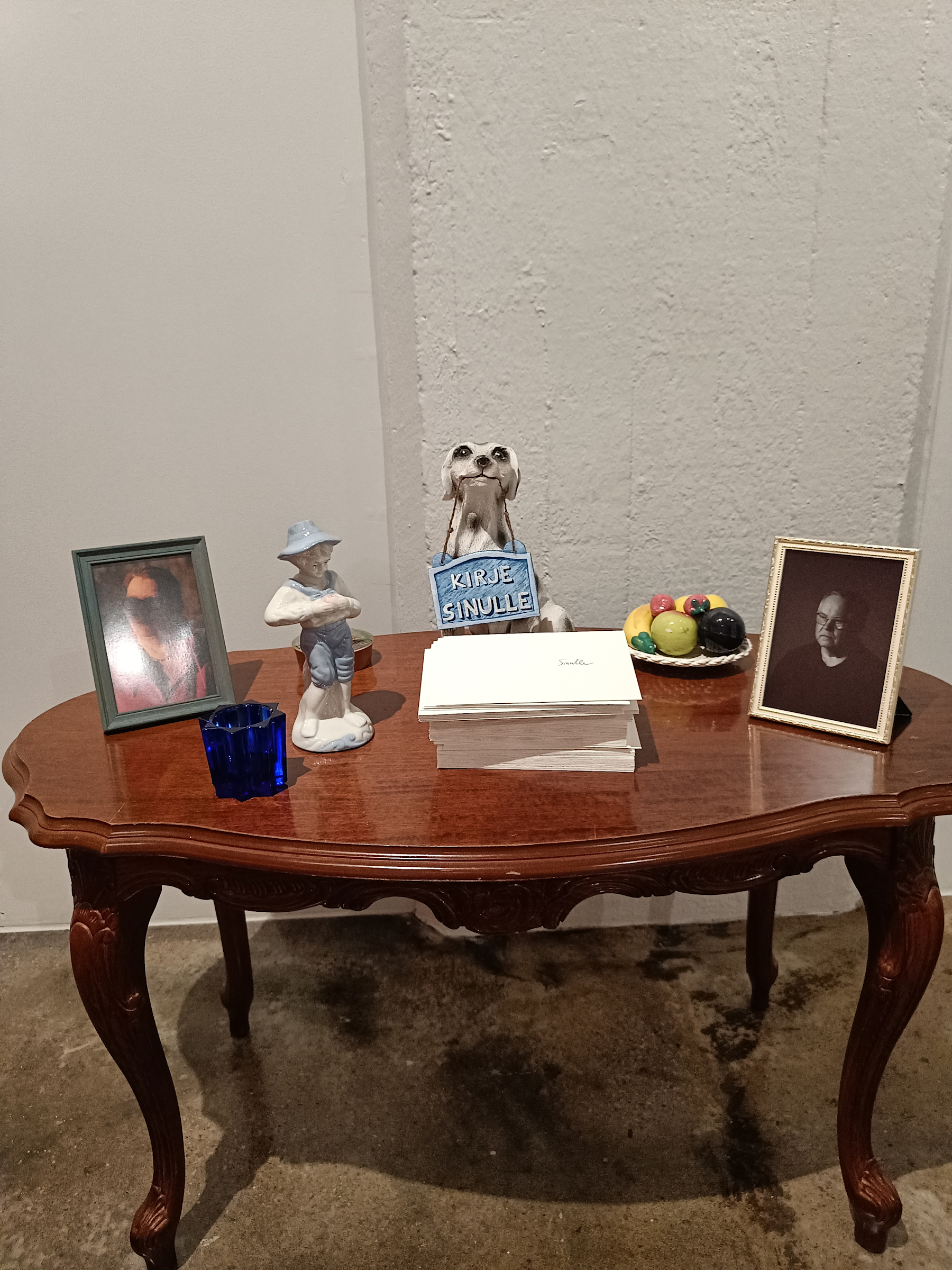 Näyttelytilaan on sijoitettu pöytä, jolle on aseteltu vanhempien valokuvat, keraamisia koristehahmoja ja posliininen hedelmävati. Pöydällä istuva luppakorvainen koirapatsas roikottaa suussaan kylttiä, jossa lukee ”Kirje sinulle”. Koiran edessä on pino kirjekuoria. Pinosta näyttelyn vierailija saa halutessaan ottaa mukaan omansa. Kuoren sisällä on mustavalkoinen kuva Berndtistä, Tarjasta, Jonnesta ja Sulo-koirasta sekä kirje, joka kertoo koskettavasti esikuvien ja representaatioiden tärkeydestä trans- ja queer-nuorille. Ja siitä, miten näyttely on tehty tuomaan lohtua ja tarjoamaan samaistumispintaa. Jotakin sellaista, mitä Sippola olisi kaivannut nuorena helpottamaan elämäänsä: ”ettei asiat mennytkään lopullisesti solmuun”.