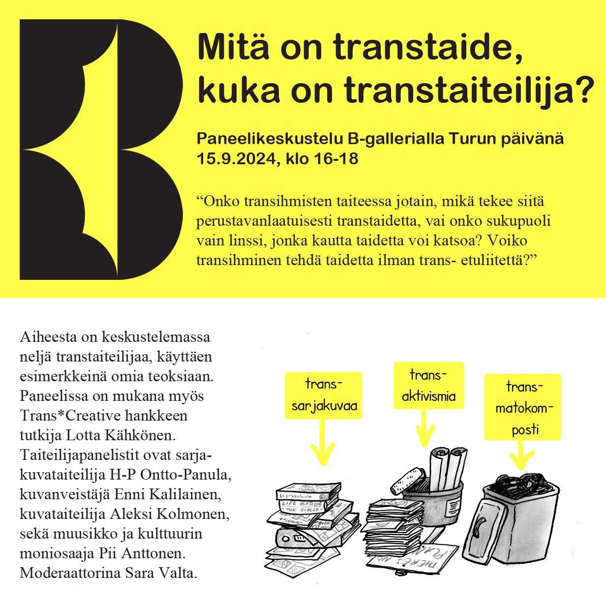 Kirje lukijalleni sai B-gallerialla todella hyvän vastaanoton, joten tapahtuma saa jatkoa. Turun päivänä, 15.9.2024 klo 16-18, järjestetään B-gallerialla (Aninkaistenkatu 6, Turku) tapahtuma transtaiteesta. Keskustelupaneelissa ovat puhumassa Trans*Creative hankkeen tutkija Lotta Kähkönen, kuvataiteilija Aleksi Kolmonen (avautuu uuteen välilehteen), kuvanveistäjä Enni Kalilainen (avautuu uuteen välilehteen), sarjakuvataiteilija H-P Ontto-Panula (avautuu uuteen välilehteen) ja muusikko ja kulttuurin moniosaaja Pii Anttonen (avautuu uuteen välilehteen).
